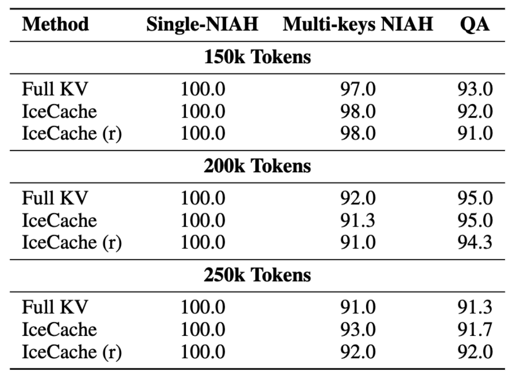 To further evaluate the performance of IceCache under extremely long-context settings, we conduct experiments on the RULER benchmark with context lengths of 150k, 200k, and 250k tokens, using a token budget of 256. The experiments are conducted using Qwen3-4B-Instruct-2507 on a single H100 GPU with 64 CPU threads enabled. As shown in the table below, IceCache and IceCache(r) consistently maintain accuracy comparable to Full-KV across all tasks and context lengths.